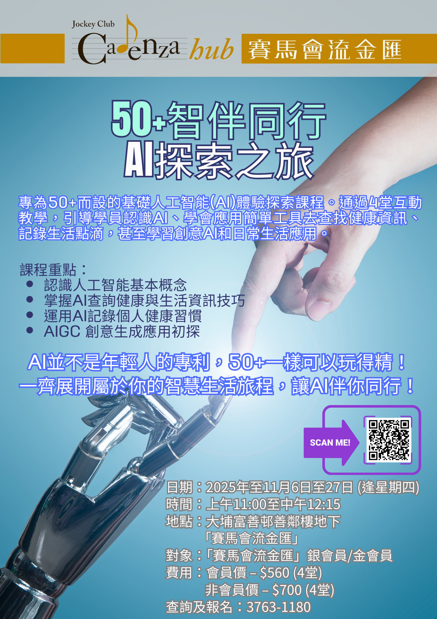 「賽馬會流金匯」特別推出《50+智伴同行:AI探索之旅》,透過4堂互動教學,帶你認識人工智能(AI)如何融入生活,從健康資訊查找、記錄生活點滴,到創意圖像製作與旅行計劃,AI都可以成為你生活的好拍檔🌟